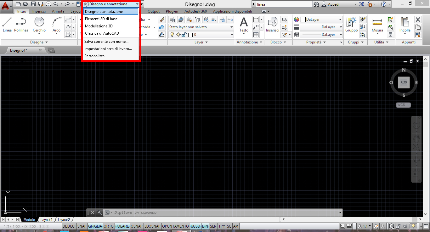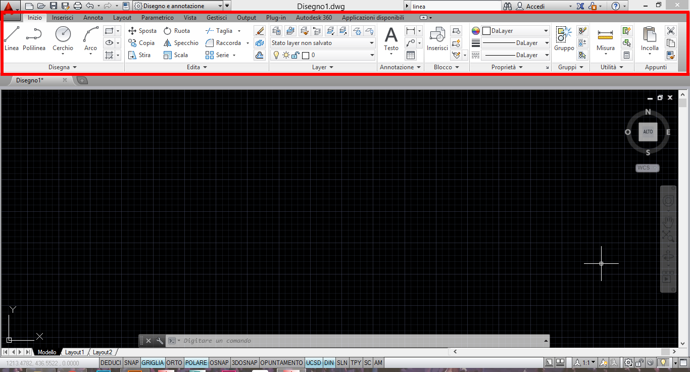 Se scegliamo l’interfaccia Disegno e annotazione, nella parte superiore troviamo una serie di menù e comandi