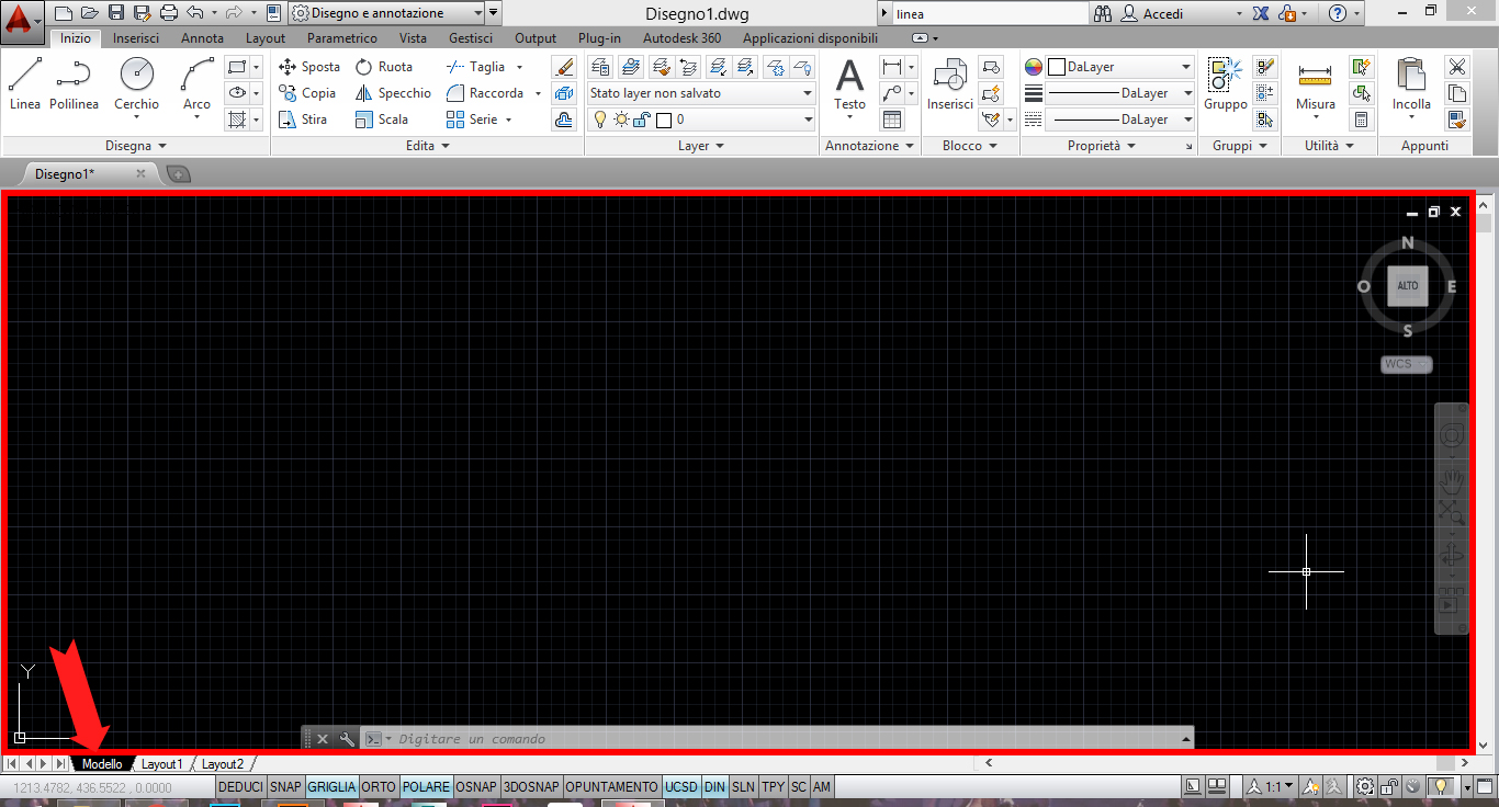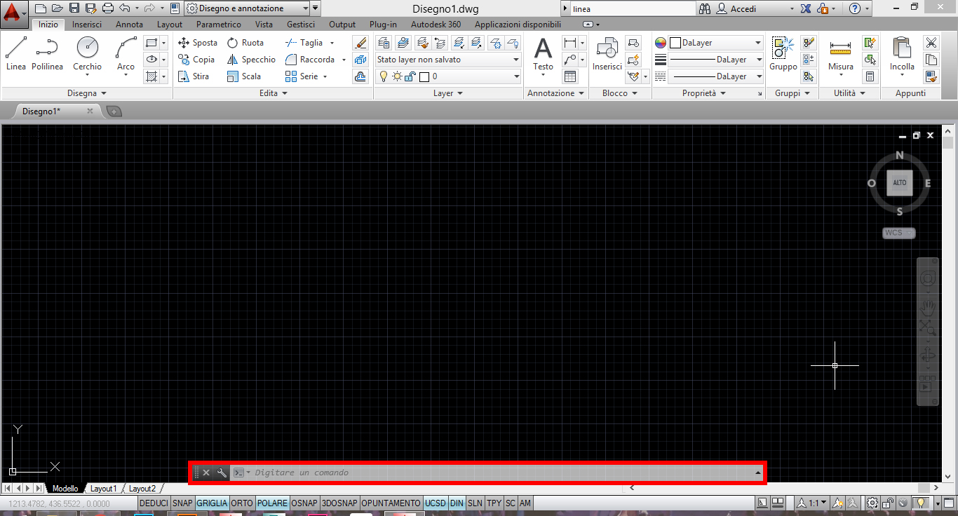 mentre nella parte inferiore troviamo un’area di digitazione dei comandi, nella quale è possibile scriverli anzichè azionarli con il mouse. Compaiono inoltre le indicazioni sull’utilizzo del comando.
